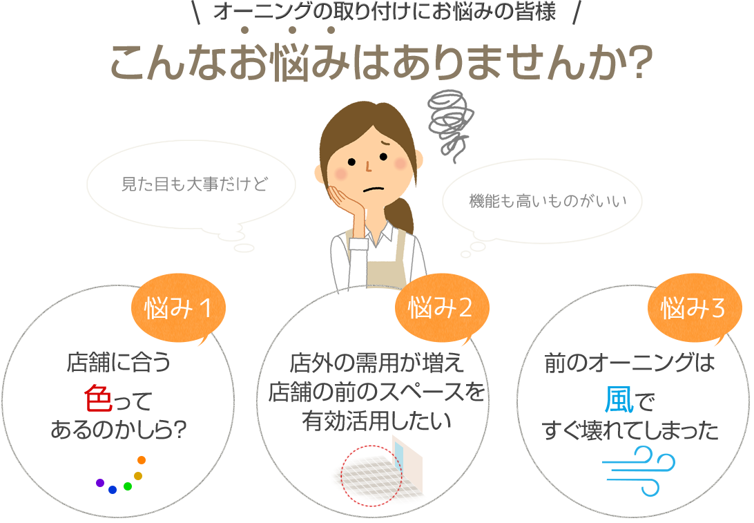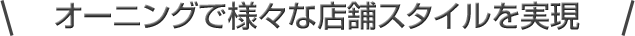 オーニングの多彩な利用方法や様々な効果で店舗運営が変わります。外のスペースの有効活用はもちろん、省エネやドレスアップなど店舗の価値を上げる手段としてご利用いただけます。