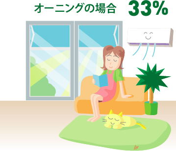 オーニングを使用した場合、エアコン使用頻度は直射日光が差し込む部屋のわずか33%という調査結果もでており、大きな省エネ効果が実証されています。エアコンのかけすぎによる冷房病や夏風邪を予防することもでき、ご家族の健康のためにも一役買う設備だと言えるでしょう。