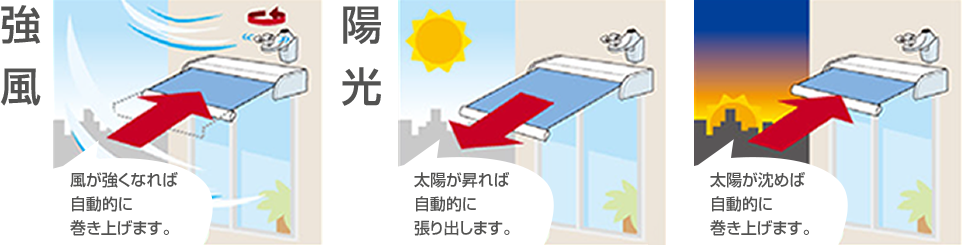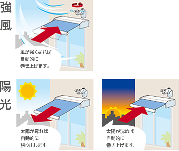 センサー制御により、オーニングを自動コントロールするシステム。強風を感知し保護機能により自動的に生地 を巻取る風力センサー。日差しの状況を感知、自動的に張出しや巻取りを行なう陽光センサー。人の手を煩わす ことなく快適な空間をサポートします。また開閉スイッチ付で、マニュアル操作も可能です。