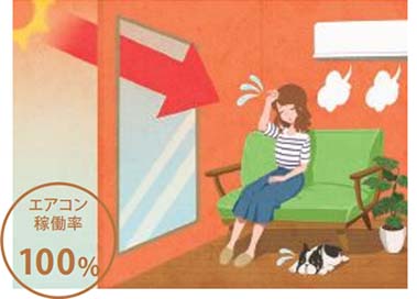 日射しが差し込む、標準ガラスの窓のある部屋でのエアコン使用度を100%とした場合。