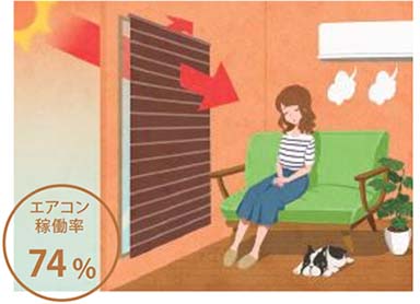 ブラインドやカーテンがついた部屋では、隙間から温められた空気が流入し、74%のエアコン使用度。
